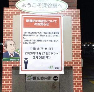 2026年1月21日㈬〜2月5日㈭にかけて深谷駅構内の時計が全て撤去されるそうです。