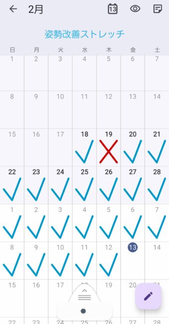 最近、姿勢改善のストレッチを3週間続けています。アプリのカレンダーに「できた日」を✓、「できなかった日」を×で記録しているのですが、この方法が意外と効果的でした。